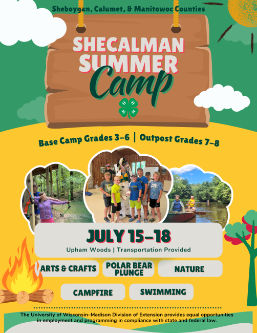 Join Manitowoc, Sheboygan, and Calumet counties for a fun-filled camping experience. Four days and three nights of adventure, fun, memories, and much much more. There will be a bus pick up and drop off at Farm Wisconsin and the Sheboygan County Fairgrounds in Plymouth, and campers will travel via bus to Upham Woods in Wisconsin Dells. During the stay campers will get to enjoy swimming, canoeing, archery, campfires, crafts, nature, and making memories. Summer 4-H Base Camp is an overnight experience open to youth grades 3 through 7.