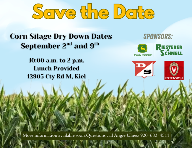 Corn Silage Dry Down Share Share:Share on FacebookShare on X (Twitter) Share via EmailCopy LinkCopied! You are viewing information about a past event. Event Information Date September 9th, 2025Time 10:00am - 2:00pmContact Angie UlnessPhone 920-683-4511Email angie.ulness@wisc.edu Event Location12905. Cty Rd M Kiel