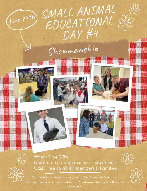 Manitowoc County Expo – Small Animal building, from 9 – 11 am. We will be demonstrating and practicing showmanship of poultry and rabbits. Please bring your own rabbit or poultry for practice. This is a hands-on event, and one of only two left before the county fair